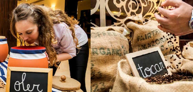 • Tocar: bolsas con granos para que el público pueda sentir en sus manos la seducción del grano del café